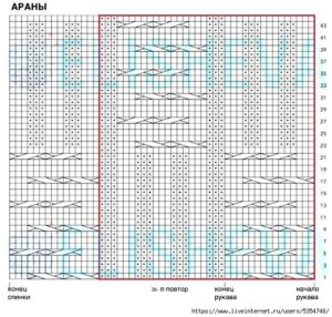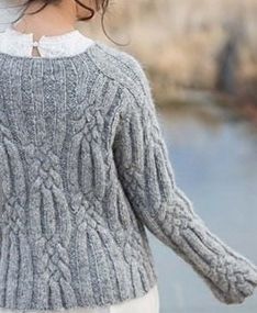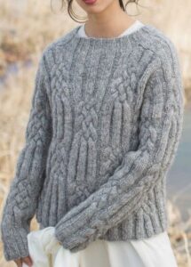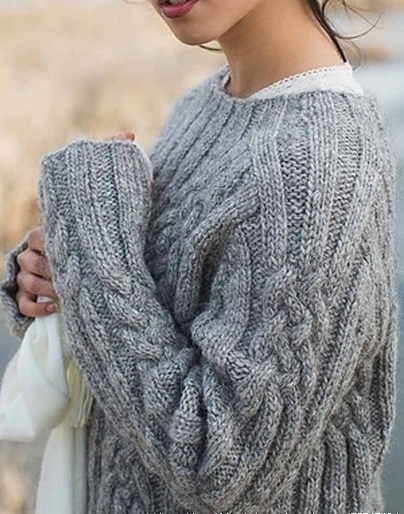 Связанный из толстой пряжи резинкой 3х3, переходящей в сложные переплетения аранов, свитер, с погонами на плечах и цельной горловиной.Пряжа: (100% исландская шерсть, 100 м / 100 г — 10 (10, 12, 13, 14) мотков.