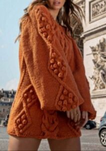 Горчично-оранжевое платье с широкими рукавами-буфами на узкой манжете-резинке, украшенное ромбовидным узором с сердцевиной из объёмных шишечек-ягодок. Слегка приталенный фасон-трапеция до середины бедра, широкие рукава-реглан и овальный вырез горловины. Нам понадобится 12 мотков — на размер 44-46 — горчично-оранжевой пряжи: 20% шерсть, 80% акрил; 100 гр — 120 м. Спицы № 5,5-6, а также вспомогательная спица для кос.Схемы вязания Выкройка