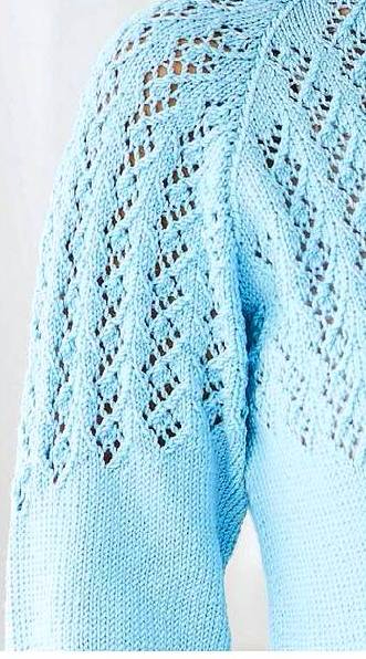 Выполнить правый шов реглана, затем присоединить левый рукав только к переду.С лицевой стороны, используя спицы 2,75 мм, присоединить нить и провязать 11 лиц. левого рукава, поднять и провязать лиц. 17 (18) 19 п. по левой стороне горловины, 19 (21) 23 п. горловины с держателя, поднять и провязать лиц. 17 (18) 19 п. по правой стороне горловины, 11 лиц. правого рукава, и 39 (43) 47 лиц. спинки — 114 (122) 130 п.