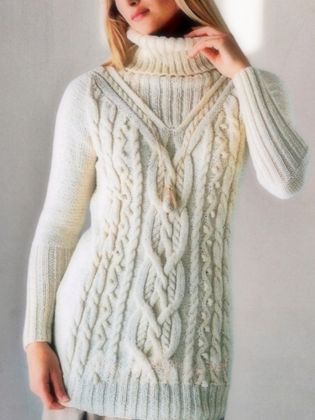 Удлиненный свитер молочно-белого цвета с аранами и косами. Для вязания нам понадобится 8 -9-10 мотков пряжи цвета экрю (100% мериносовая шерсть, ; 115м/50 г). Спицы № 4-4,5 и спицы для кос.