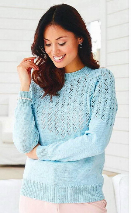 Джемпер реглан спицами с ажурной кокеткой